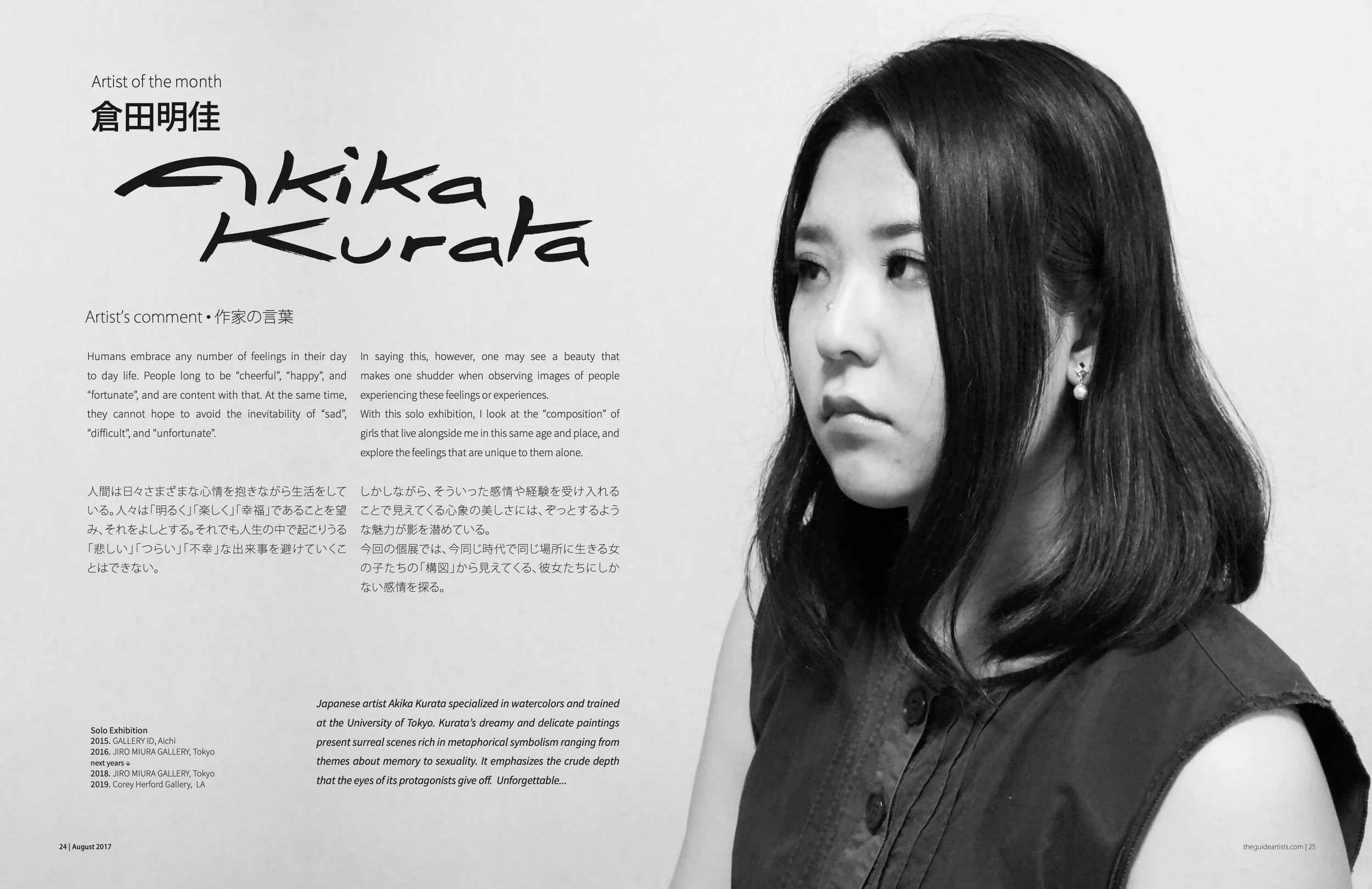 In August 2017, Akika Kurata appeared on the cover of Issue 6 of The Guide Artists Magazine, establishing her presence in the international contemporary art scene. The issue included a feature where she shared her thoughts on portraiture, emotion, and the subtle tensions that define her work.