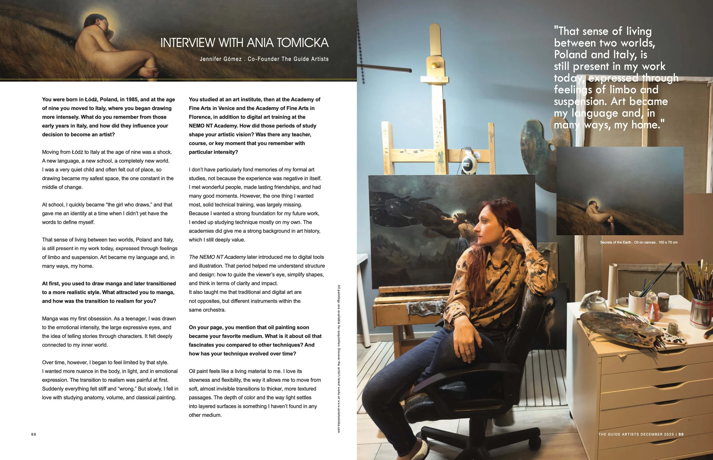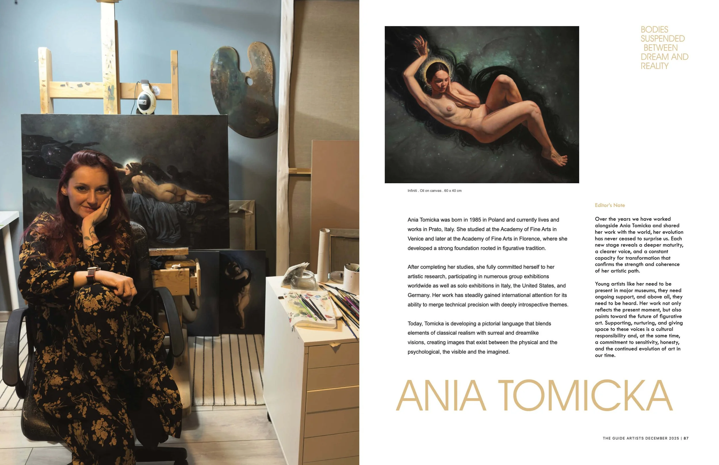 Ania Tomicka was born in 1985 in Poland and currently lives and works in Prato, Italy. She studied at the Academy of Fine Arts in Venice and later at the Academy of Fine Arts in Florence, where she developed a strong foundation rooted in figurative tradition.