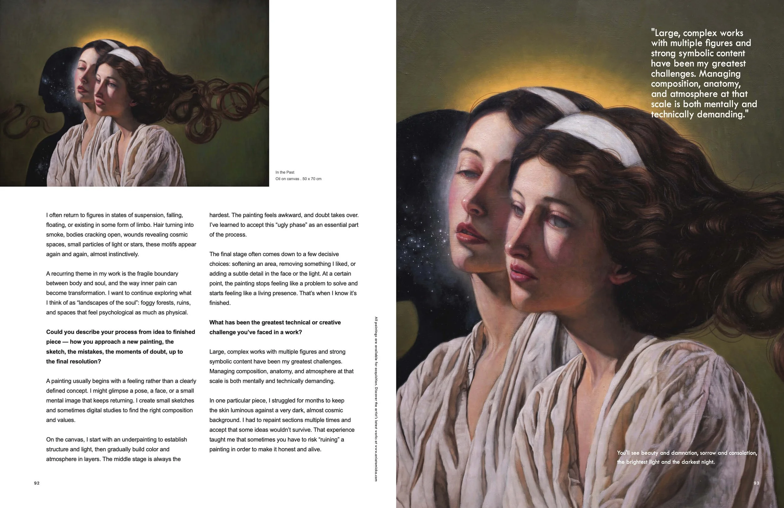 A recurring theme in my work is the fragile boundary between body and soul, and the way inner pain can become transformation. I want to continue exploring what I think of as “landscapes of the soul”: foggy forests, ruins, and spaces that feel psychological as much as physical.