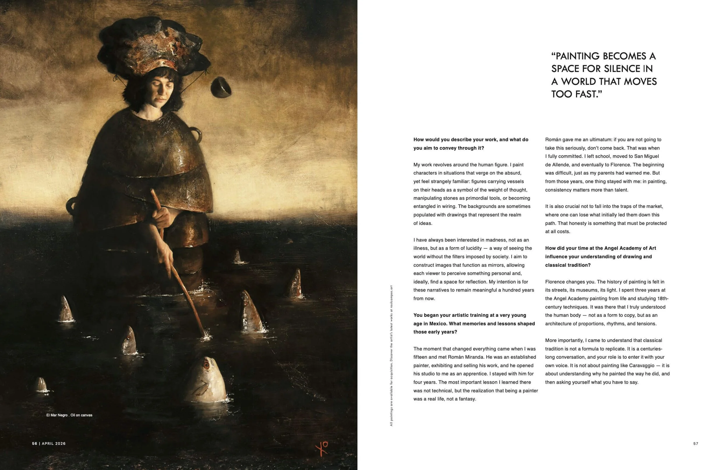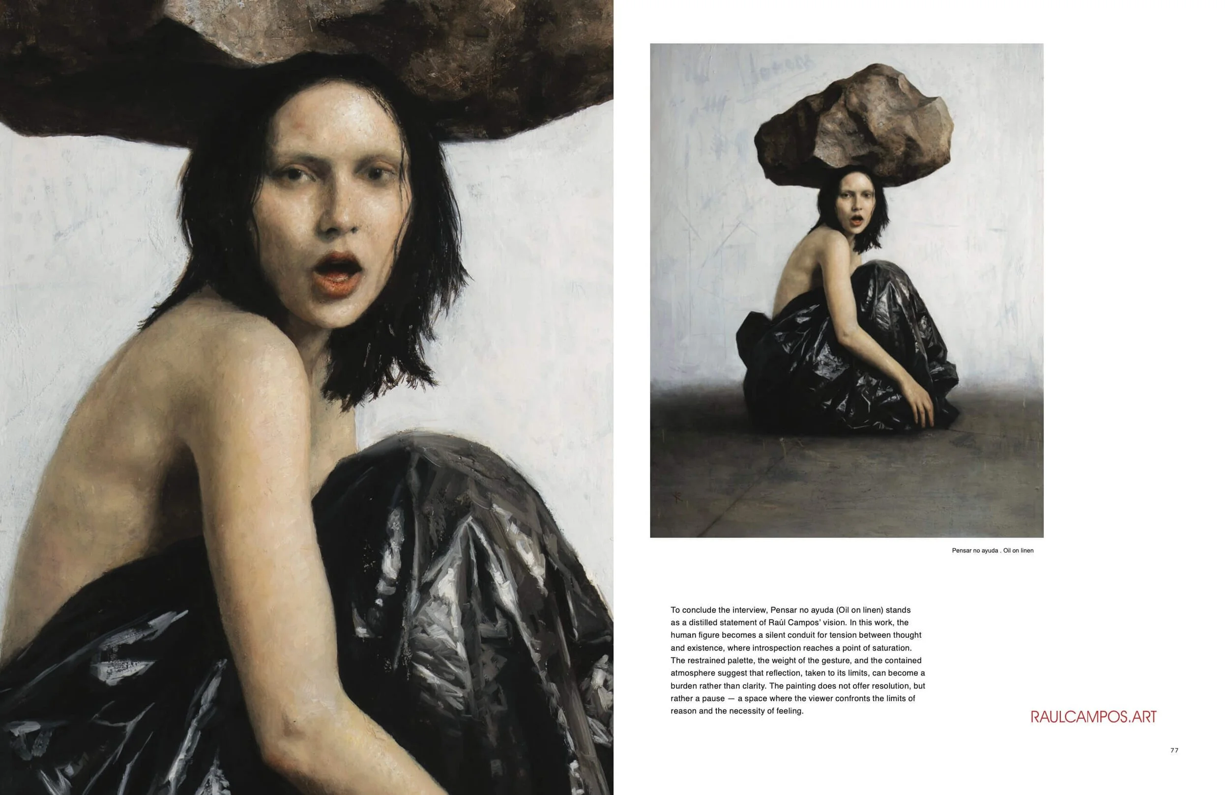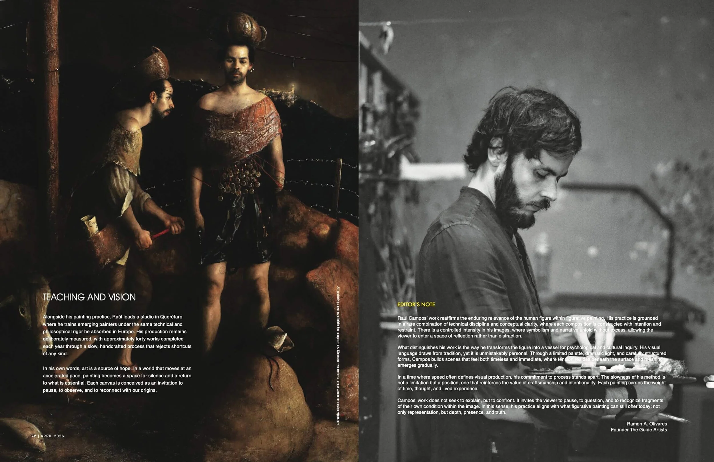 This special issue features Raúl Campos Herrera on the cover with Pensar no ayuda (oil on linen, 2026), a work that encapsulates his disciplined approach to figurative painting. Through a restrained palette, precise composition, and a subtle orchestration of light, Raúl Campos constructs images that explore psychological depth and inner tension with remarkable clarity.