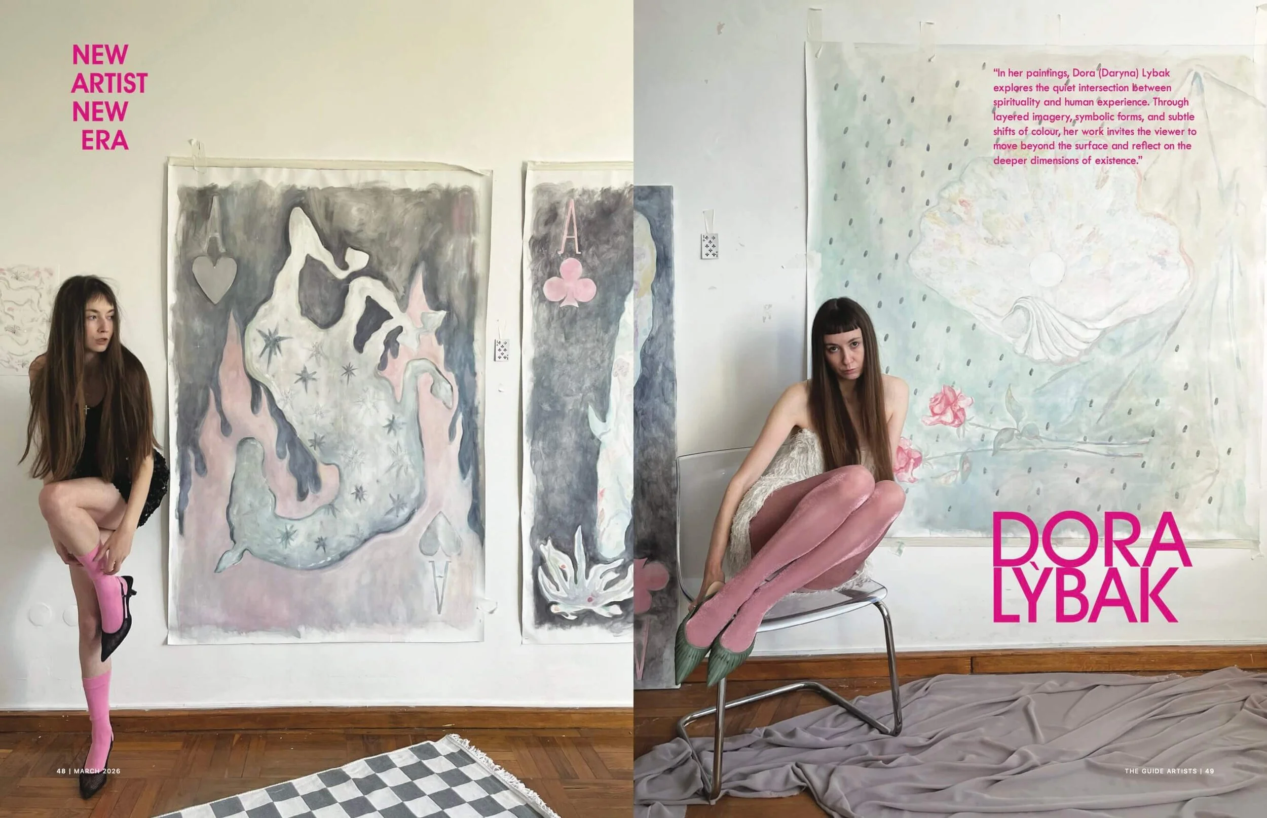 Dora (Daryna) Lybak was born in 1997 in Rivne, Ukraine, where she currently lives and works. She earned a Master’s degree in Fine and Decorative Arts, specialising in Artistic Textiles, from the Rivne State University of Humanities. Her academic training provided a solid understanding of composition, material, and visual language. For a period, she worked as an art history teacher at the Rivne State Children’s Art School, an experience that deepened her knowledge of artistic traditions before she decided to fully dedicate herself to her own creative path.