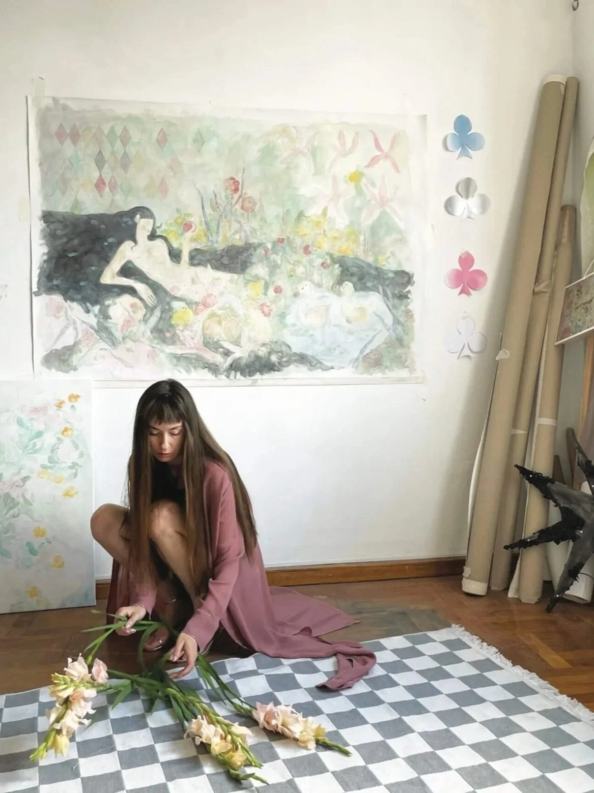 Material experimentation also forms part of her practice. While oil painting remains the defining medium in her work, she frequently combines it with acrylic, spray paint, and glitter, building layered surfaces that enhance the visual and symbolic depth of her compositions.